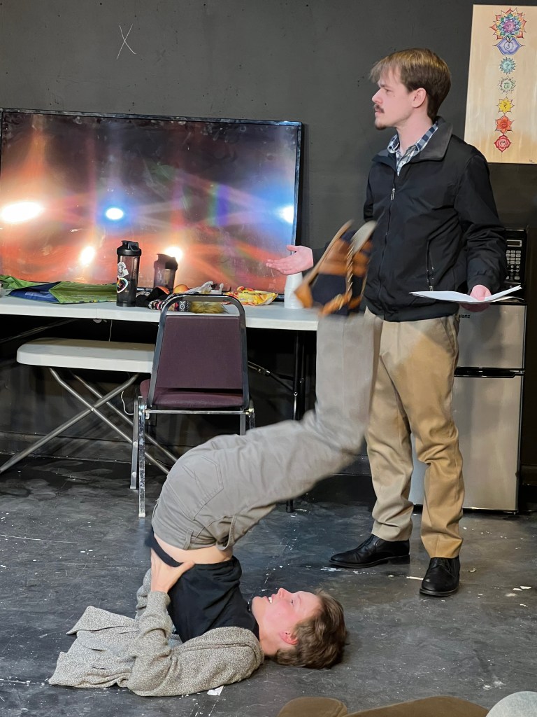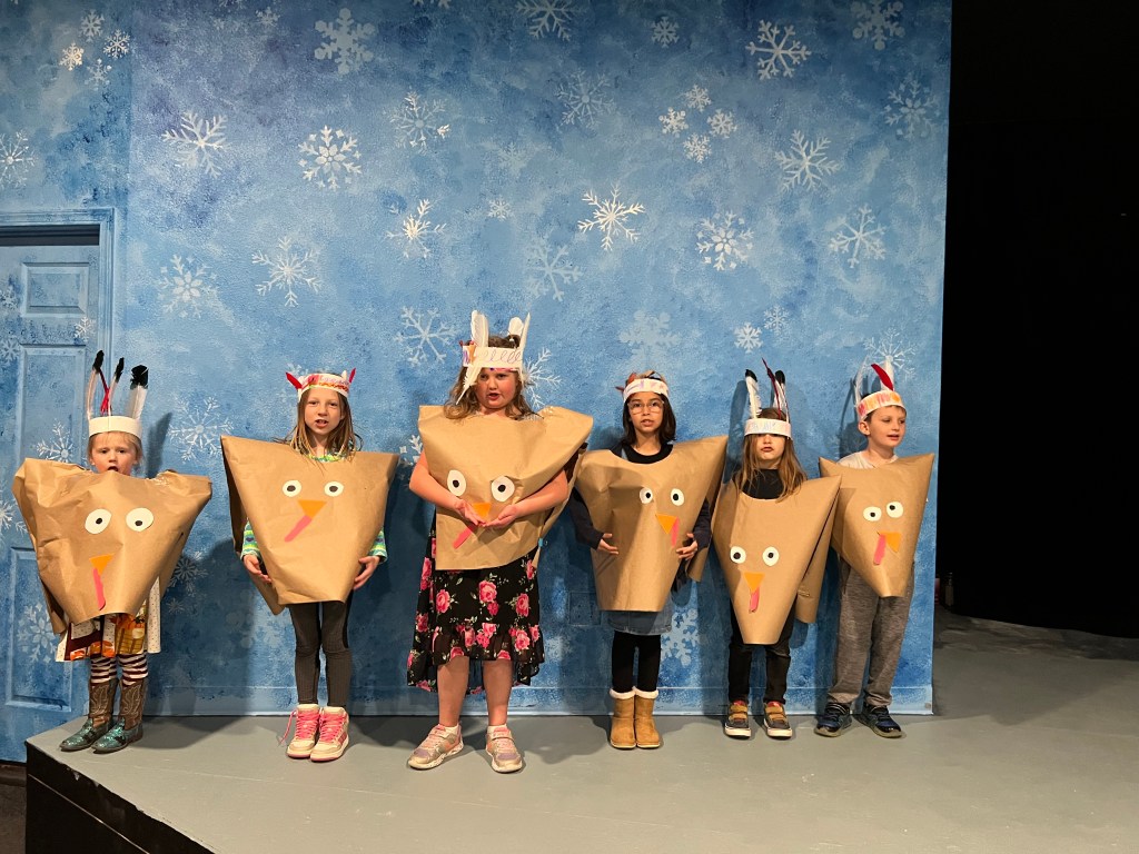 On the flip side, the play makes a mockery of the “traditions” of Thanksgiving as have been taught to the nation’s schoolchildren for generations. This is represented in the video segments interpolated between scenes, which the playwright inserted as examples of actual children’s performances found on YouTube. (In this production, child actors from the Casper Children’s Theatre were recorded performing the sketches). Some of the most degrading stereotypes of Native Americans, combined with complete misprision of the history of the Pilgrims, have found their way into the collective psyche of Americans by means of recitals such as these. Ignorance and bias are obscured by cuteness and mindless sloganeering while the children are paraded before their parents dressed in adorable little outfits. None of this is conducive to the purpose of a real education, which is not to tell children what to think, or even how to think, but to equip them with the tools they will need when they think, thus enabling them to distinguish fact from fiction, truth from lies, reality from delusion, and utility from fantasy; and more importantly, that there is such a thing as an objective reality that can be known, studied, and authenticated over and against magical thinking, emotional reasoning, and self-blinding subjectivity.