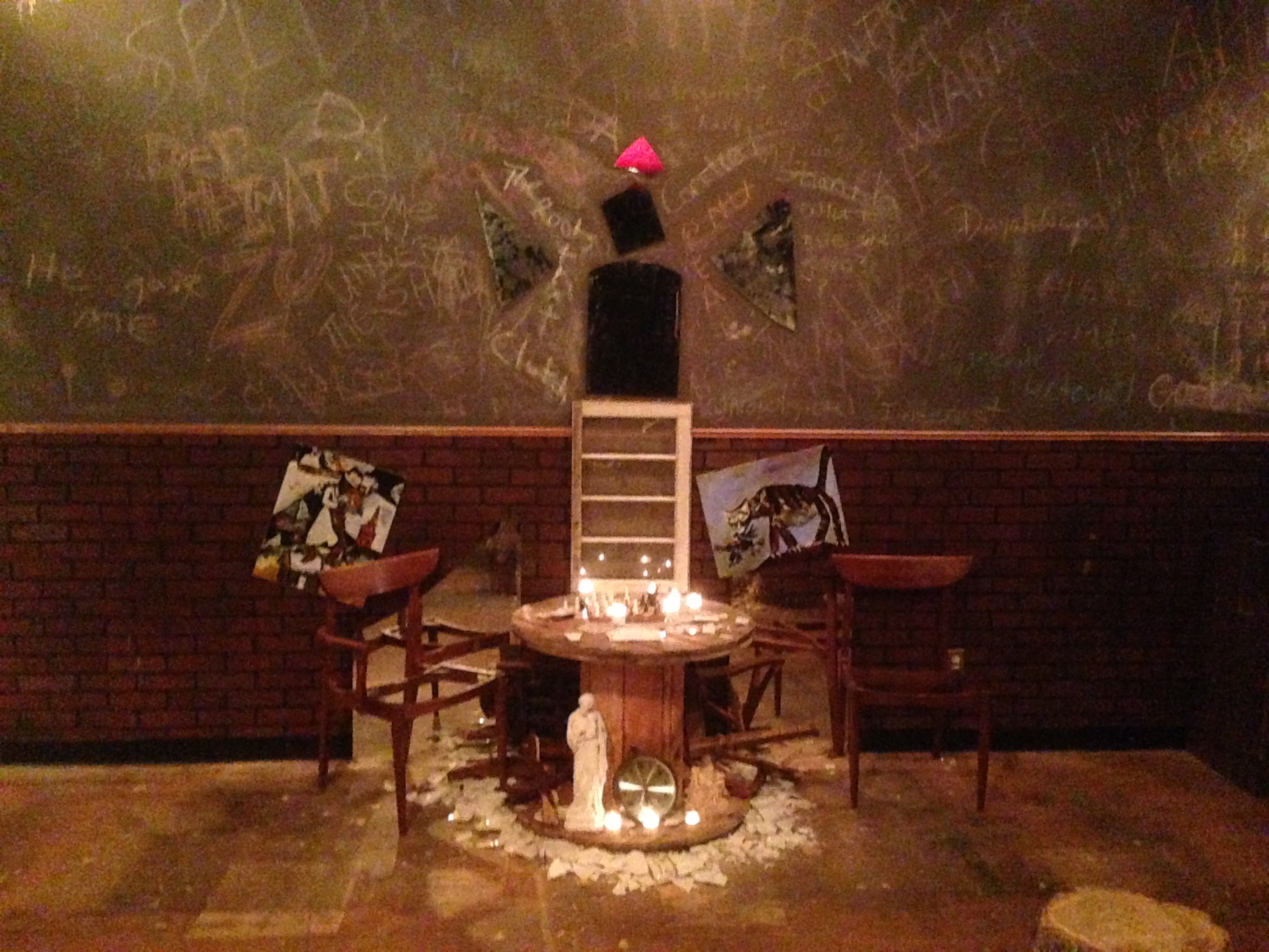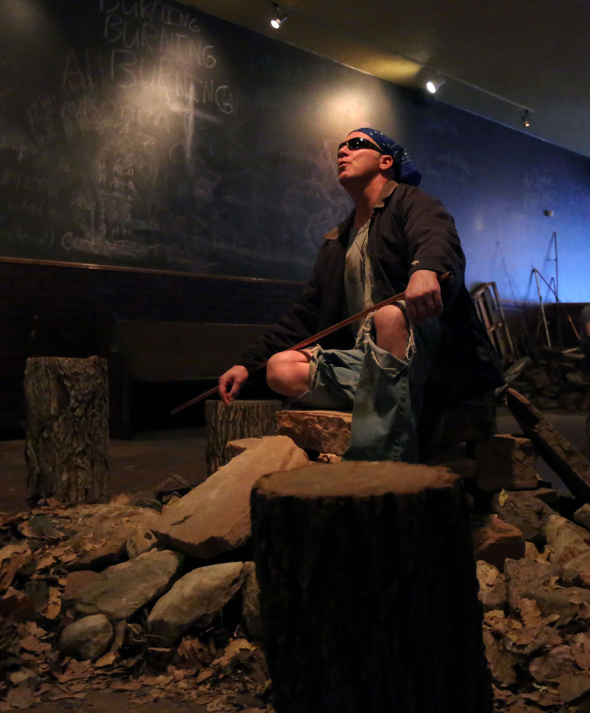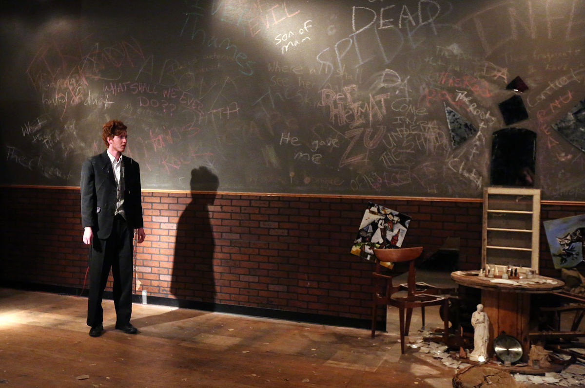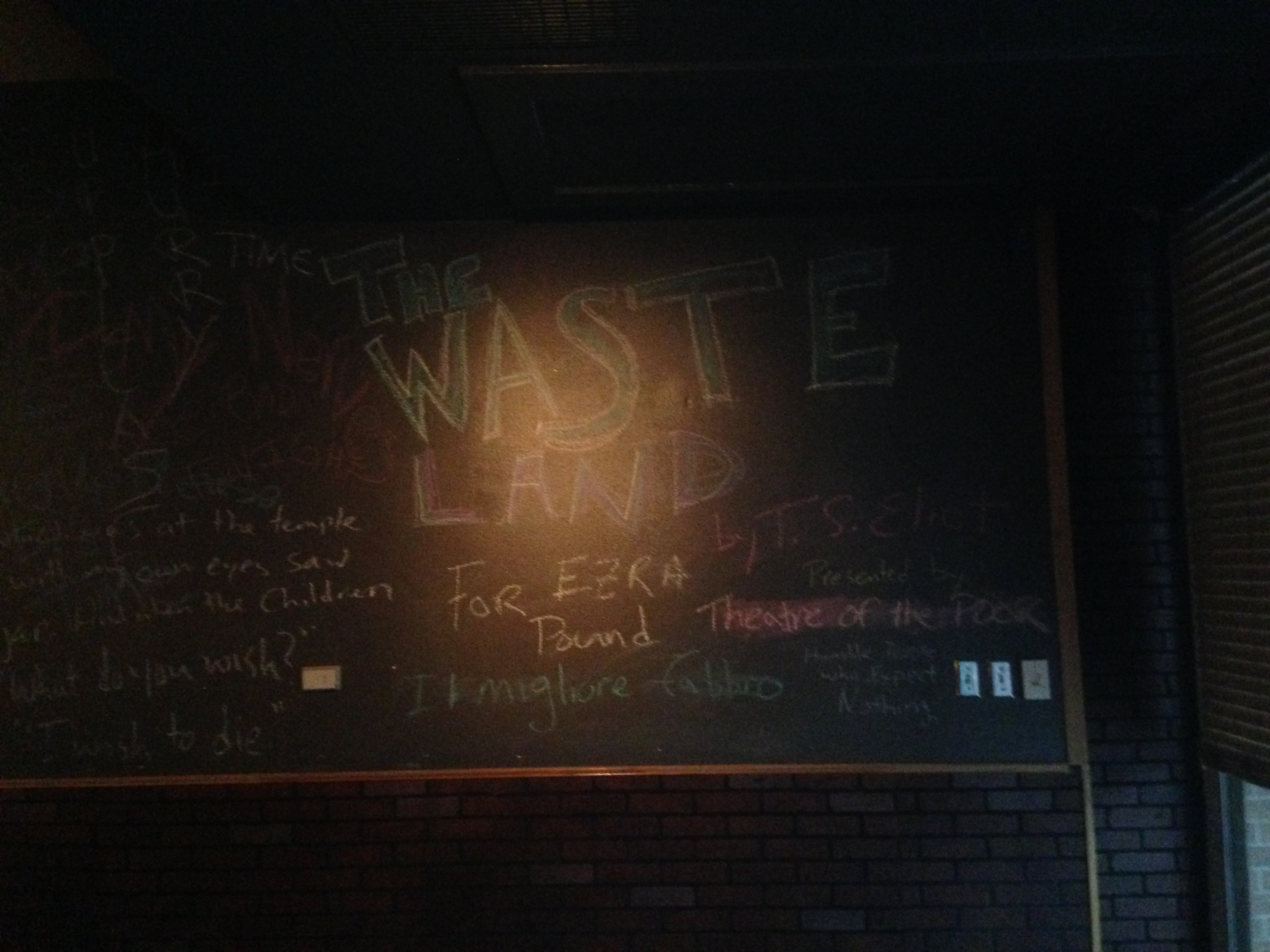 Graffiti consisting of quotes, references, and allusions from the poem in several different languages were chalked on the walls.William T. Wallace as the NarratorAn example of one of nine “stations” comprising the total immersive environment.The Transformation of Philomel: Ariel Chambers takes flight as she flees her tormentor and is turned into a nightingale.Tricia Levitt Lovelace as Madame Sosostris, “famous clairvoyant.”Dawn Anderson as the Hyacinth Girl: “looking into the heart of light, the silence.”The Hyacinth Girl’s “Garden”The fortune-telling booth of Madame SosostrisWilliam Conte as the Prophet Tiresias“What branches grow out of this stony rubbish?”The copper sheet was used for percussion to accompany music performed by Caleb Phillips.Candlelight throughout the space imbued the environment with a sense of ritual.99 candles illuminated every performance.The center piece