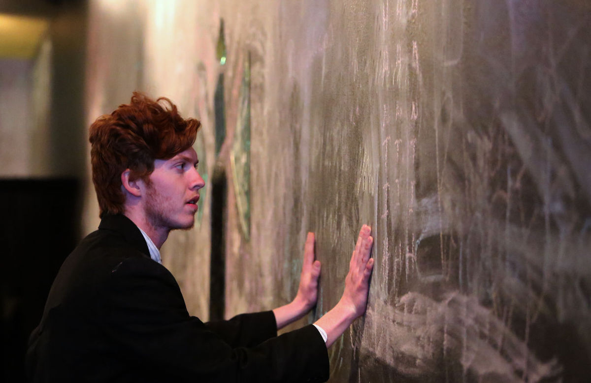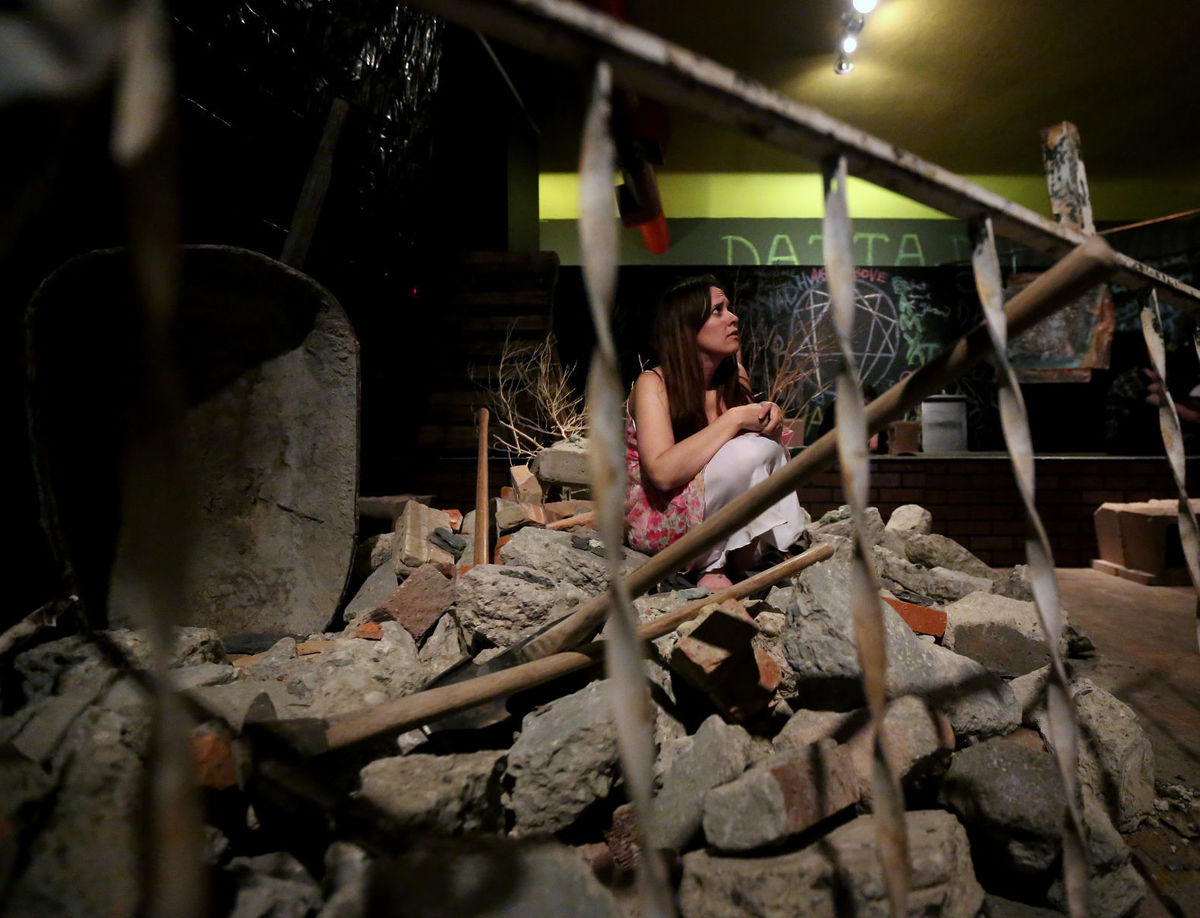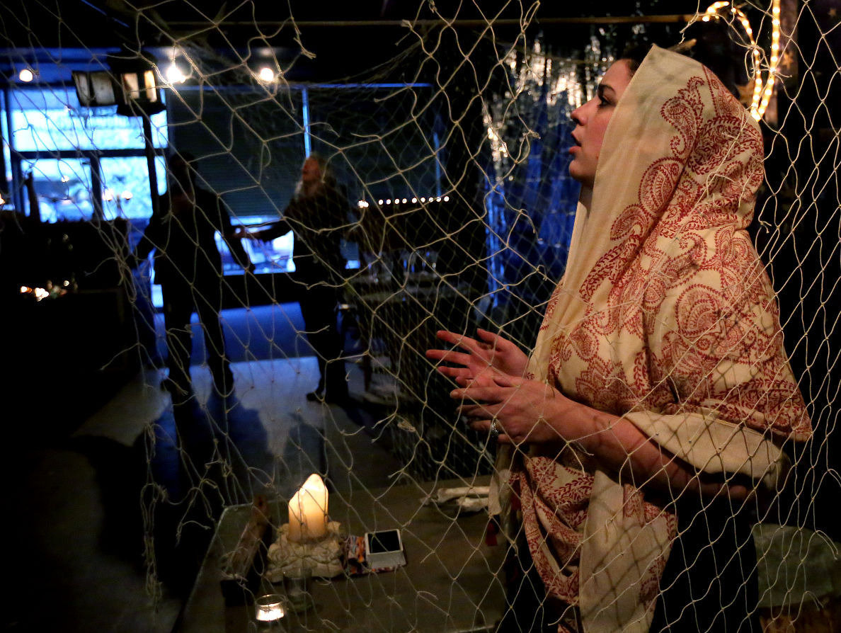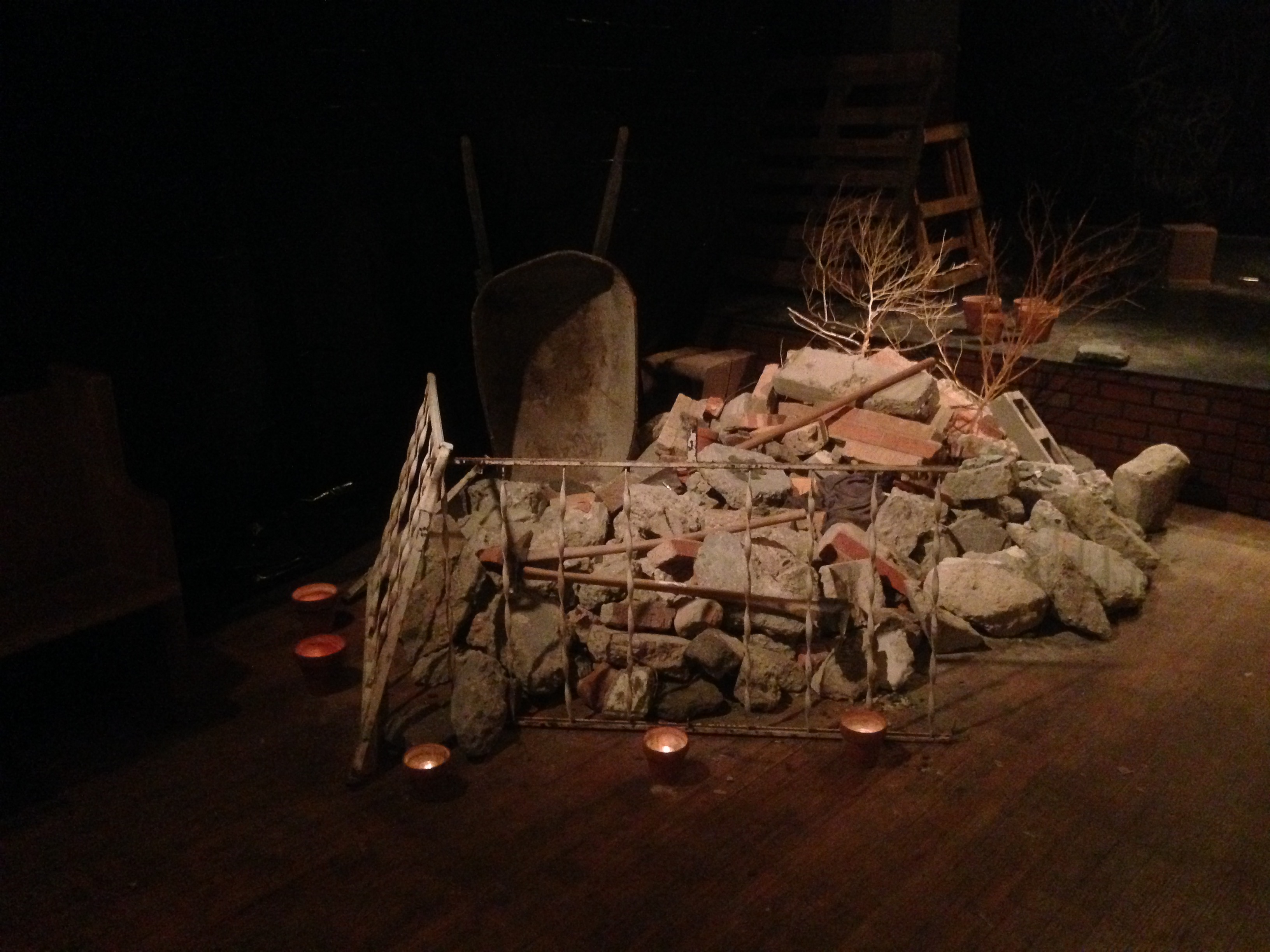 Graffiti consisting of quotes, references, and allusions from the poem in several different languages were chalked on the walls.William T. Wallace as the NarratorAn example of one of nine “stations” comprising the total immersive environment.The Transformation of Philomel: Ariel Chambers takes flight as she flees her tormentor and is turned into a nightingale.Tricia Levitt Lovelace as Madame Sosostris, “famous clairvoyant.”Dawn Anderson as the Hyacinth Girl: “looking into the heart of light, the silence.”The Hyacinth Girl’s “Garden”The fortune-telling booth of Madame SosostrisWilliam Conte as the Prophet Tiresias“What branches grow out of this stony rubbish?”The copper sheet was used for percussion to accompany music performed by Caleb Phillips.Candlelight throughout the space imbued the environment with a sense of ritual.99 candles illuminated every performance.The center piece
