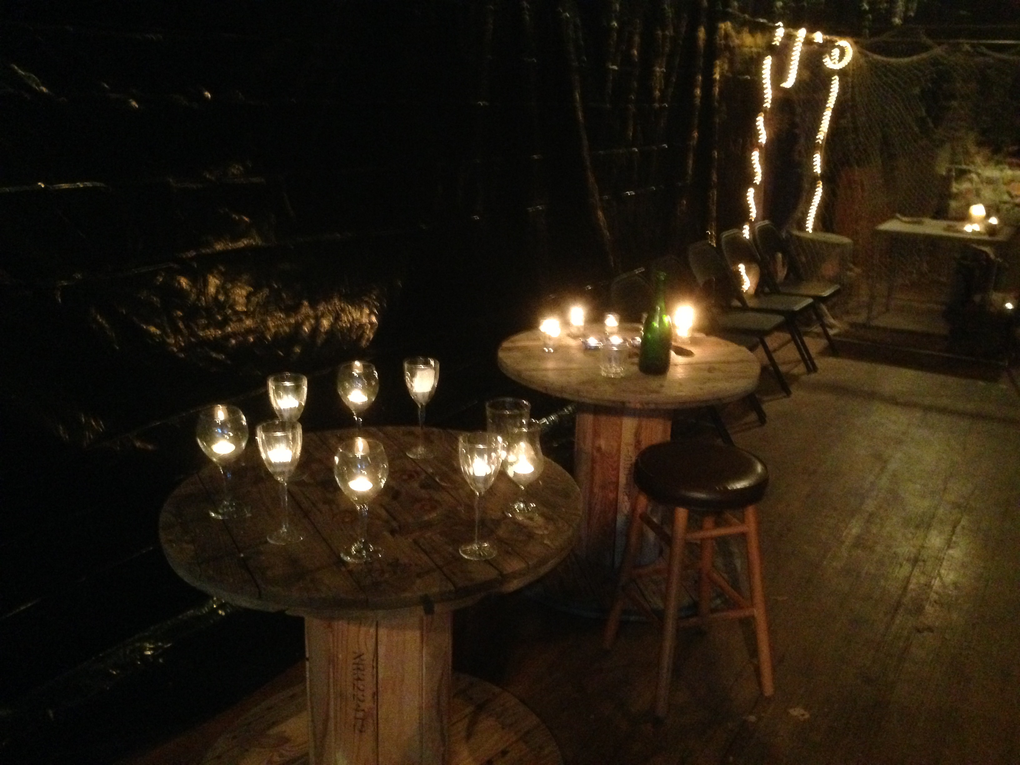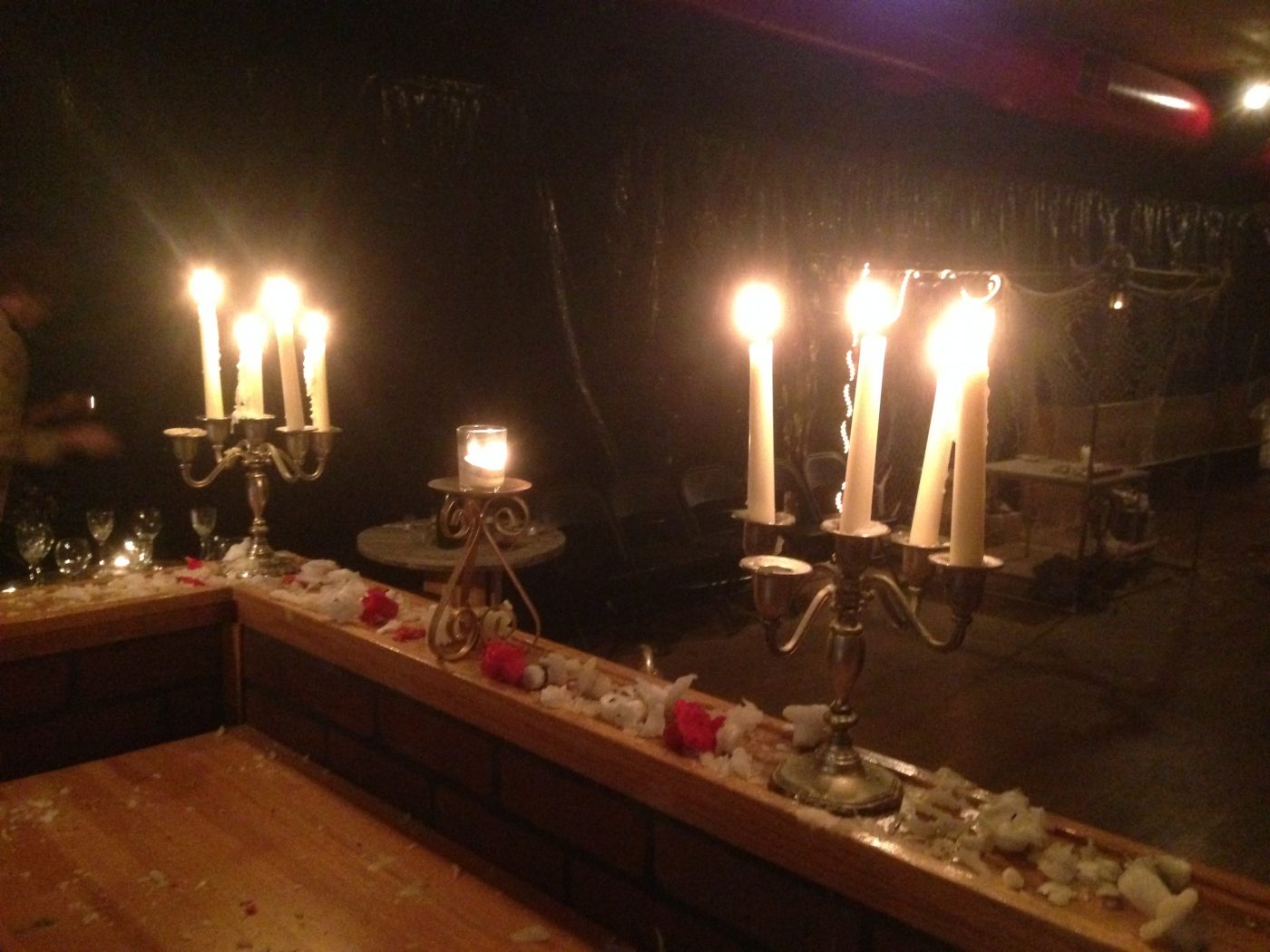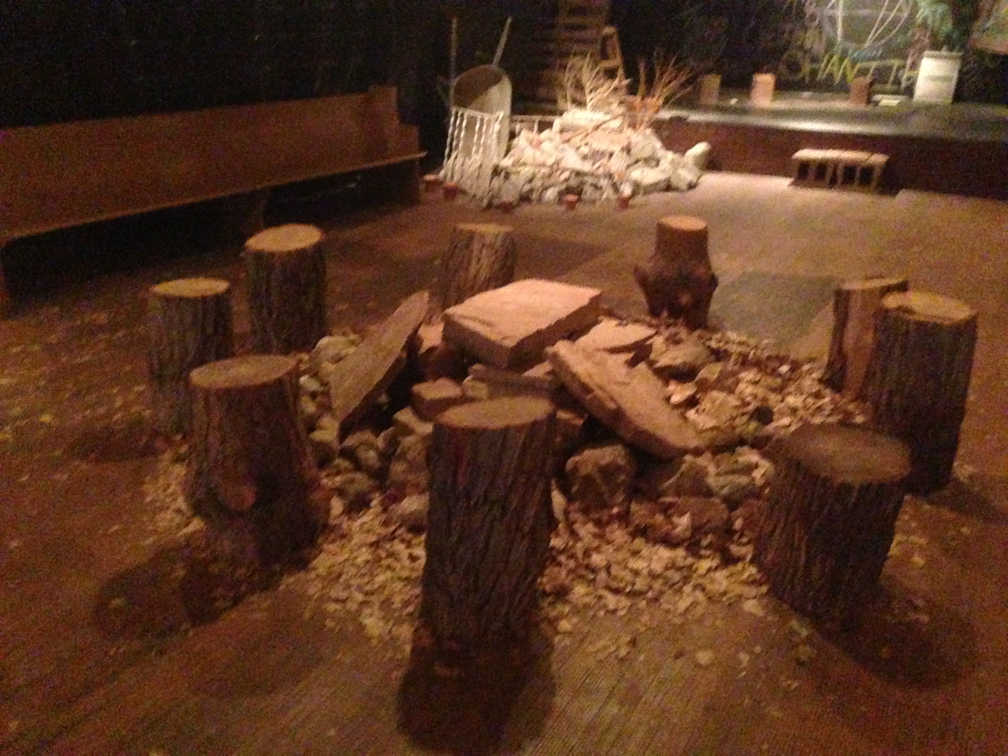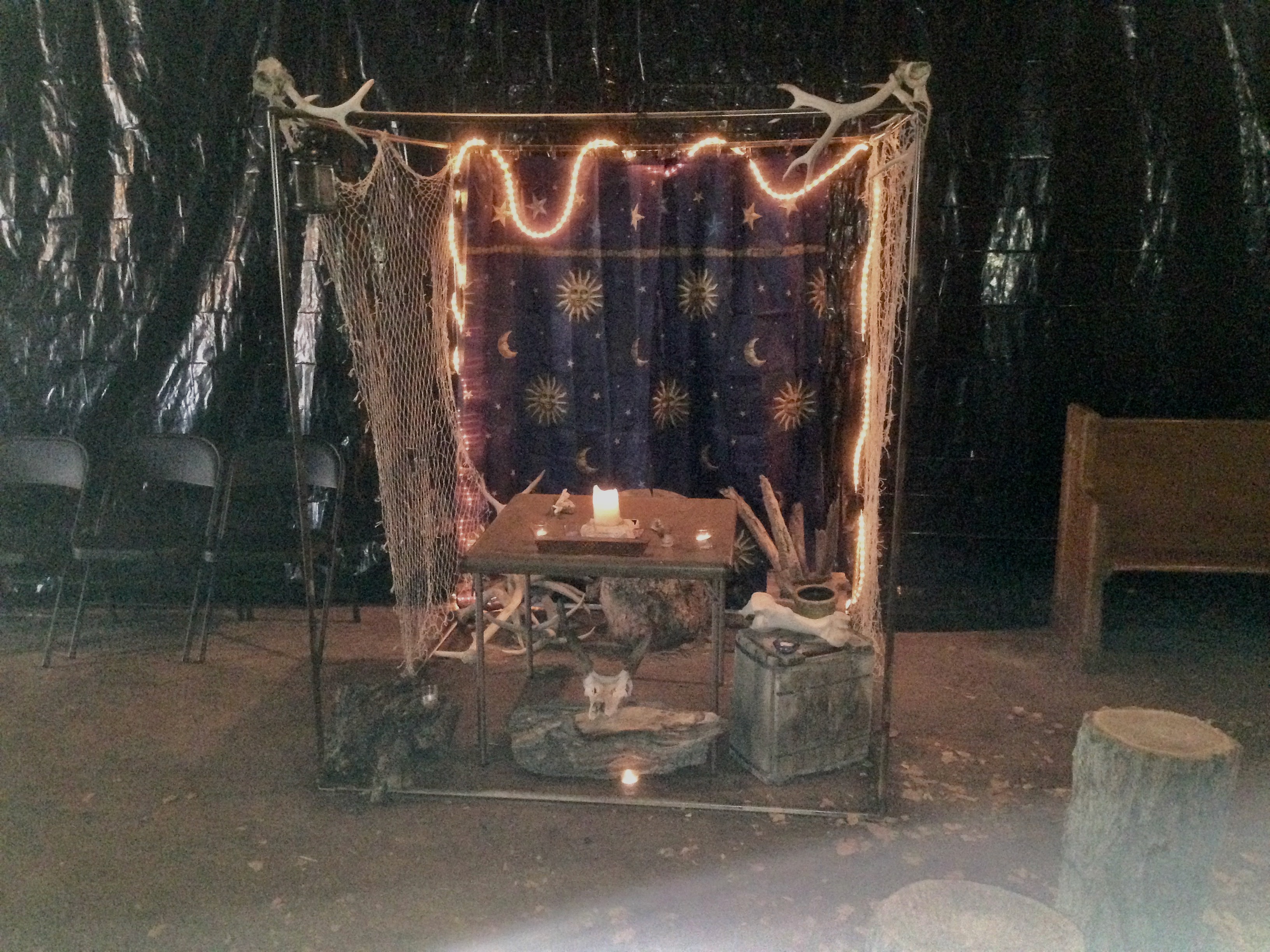 Graffiti consisting of quotes, references, and allusions from the poem in several different languages were chalked on the walls.William T. Wallace as the NarratorAn example of one of nine “stations” comprising the total immersive environment.The Transformation of Philomel: Ariel Chambers takes flight as she flees her tormentor and is turned into a nightingale.Tricia Levitt Lovelace as Madame Sosostris, “famous clairvoyant.”Dawn Anderson as the Hyacinth Girl: “looking into the heart of light, the silence.”The Hyacinth Girl’s “Garden”The fortune-telling booth of Madame SosostrisWilliam Conte as the Prophet Tiresias“What branches grow out of this stony rubbish?”The copper sheet was used for percussion to accompany music performed by Caleb Phillips.Candlelight throughout the space imbued the environment with a sense of ritual.99 candles illuminated every performance.The center piece